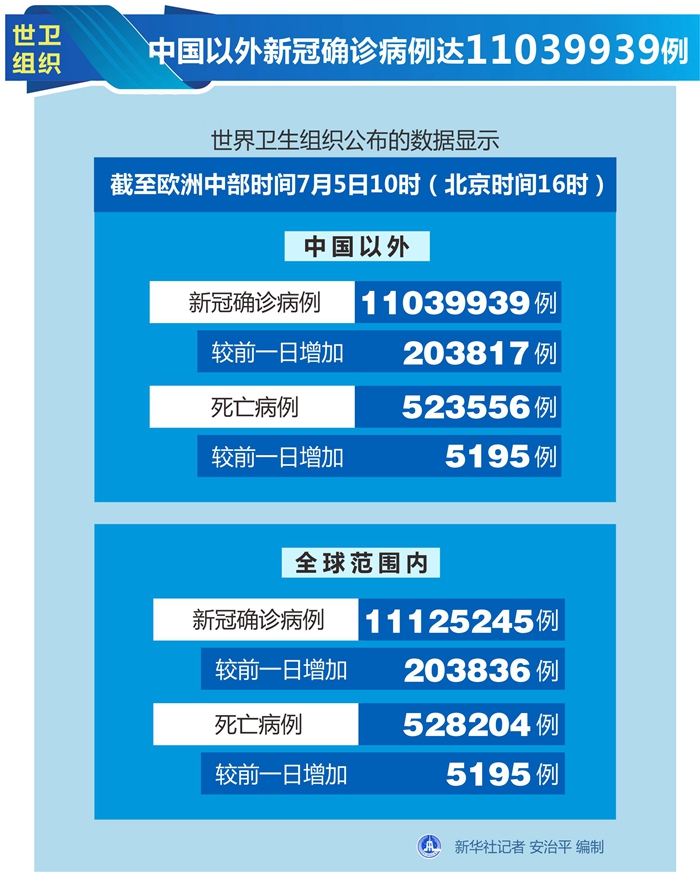世衛組織每日疫情報告顯示,截至歐洲中部時間5日10時(北京時間16時),中國以外新冠確診病例較前一日增加203817例,達到11039939例;中國以外死亡病例較前一日增加5195例,達到523556例。