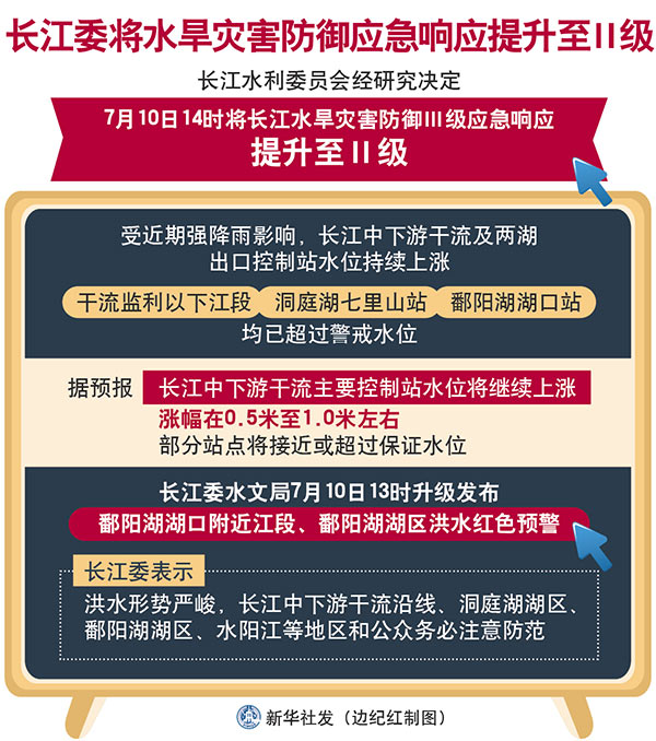 新華社武漢7月10日電(記者李思遠(yuǎn)、樂文婉)鑒于當(dāng)前長江流域洪水防御的嚴(yán)峻形勢,長江水利委員會經(jīng)研究決定,10日14時將長江水旱災(zāi)害防御Ⅲ級應(yīng)急響應(yīng)提升至Ⅱ級。