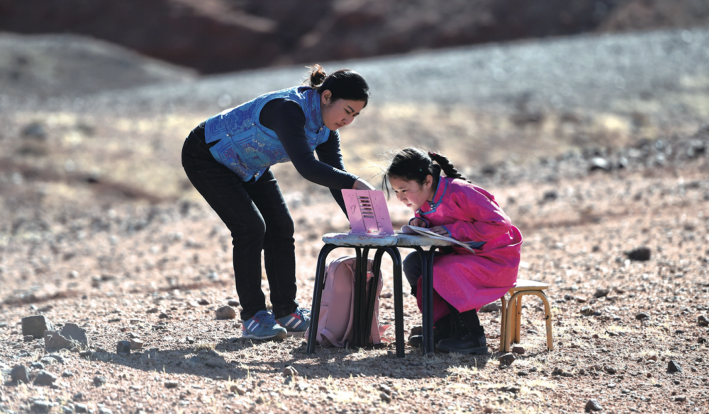 4月1日,內蒙古自治區(qū)阿拉善左旗蒙古族學校四年級學生策耿(右)在家附近的戈壁上上網課(劉磊/攝)