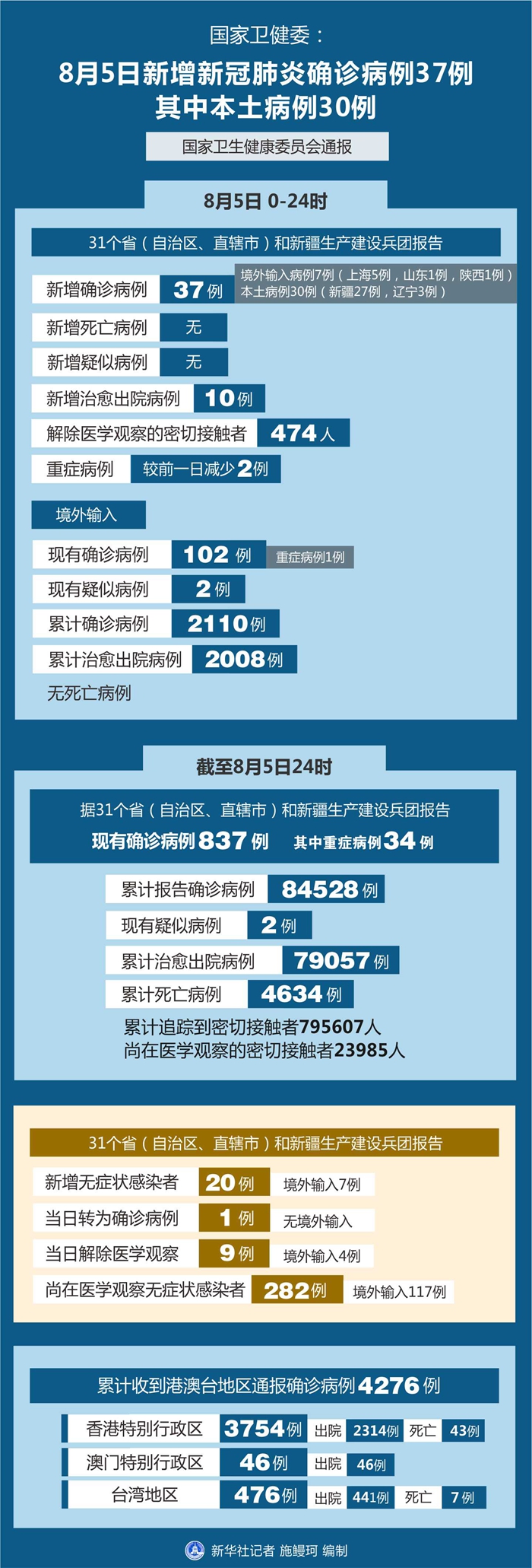 新華社北京8月6日電 國家衛生健康委員會6日通報,8月5日0—24時,31個省(自治區、直轄市)和新疆生產建設兵團報告新增新冠肺炎確診病例37例,其中境外輸入病例7例(上海5例,山東1例,陜西1例),本土病例30例(新疆27例,遼寧3例);無新增死亡病例;無新增疑似病例。