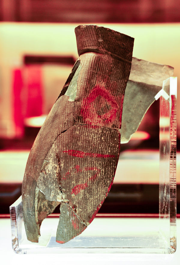 陶寺遺址出土的朱書扁壺,其上為朱砂書寫的“堯”字