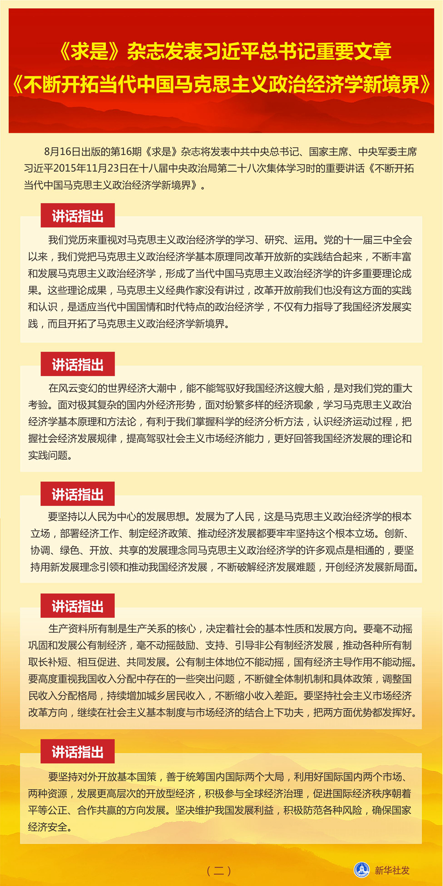 新華社北京8月15日電 8月16日出版的第16期《求是》雜志將發(fā)表中共中央總書記、國家主席、中央軍委主席習(xí)近平2015年11月23日在十八屆中央政治局第二十八次集體學(xué)習(xí)時的重要講話《不斷開拓當(dāng)代中國馬克思主義政治經(jīng)濟學(xué)新境界》。