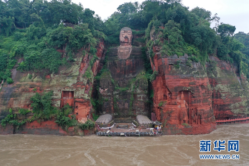 8月19日,隨著洪水減退,樂(lè)山大佛的腳趾已重新露出水面,水位退至佛腳平臺(tái)以下,一江之隔的鳳洲島水位也已退下。新華網(wǎng)發(fā)(李昕鋒 攝)