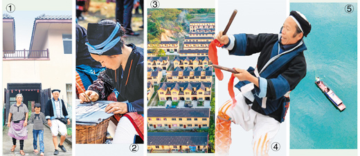圖①:在“千家瑤寨·萬(wàn)戶瑤鄉(xiāng)”八圩瑤寨易地扶貧搬遷安置點(diǎn),村民黎治明(右)一家走出家門。