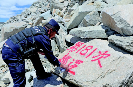 索朗達(dá)杰在崗布冰川巡邏時,在石塊上標(biāo)記巡邏次數(shù)。 本報記者劉小草攝