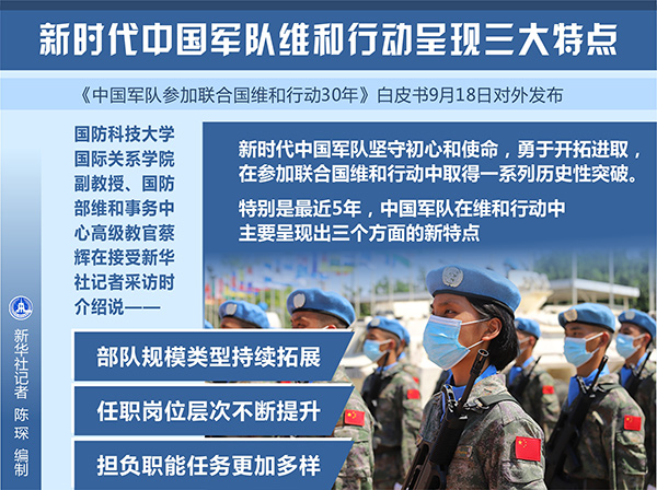 新華社北京9月18日電(記者黎云、張汨汨)《中國(guó)軍隊(duì)參加聯(lián)合國(guó)維和行動(dòng)30年》白皮書(shū)18日對(duì)外發(fā)布。國(guó)防科技大學(xué)國(guó)際關(guān)系學(xué)院副教授、國(guó)防部維和事務(wù)中心高級(jí)教官蔡輝在接受新華社記者采訪時(shí)介紹說(shuō),新時(shí)代中國(guó)軍隊(duì)堅(jiān)守初心和使命,勇于開(kāi)拓進(jìn)取,在參加聯(lián)合國(guó)維和行動(dòng)中取得一系列歷史性突破。特別是最近5年,中國(guó)軍隊(duì)在維和行動(dòng)中主要呈現(xiàn)出三個(gè)方面的新特點(diǎn)。