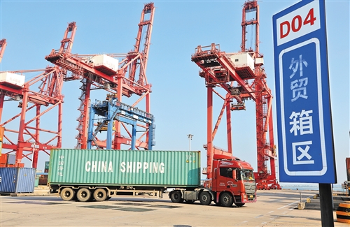 近日,運輸車輛在江蘇連云港集裝箱碼頭轉運集裝箱準備裝船出口國外。 海關總署發布的數據顯示,今年前8個月,我國貨物貿易進出口總值20.05萬億元,同比下降0.6%,降幅持續收窄,接近“轉正”。