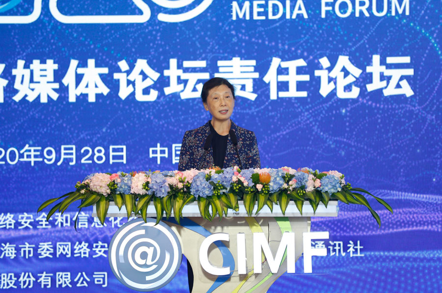 中國傳媒大學新聞傳播學部學部長高曉虹在2020中國網絡媒體論壇責任論壇上做主題演講。新華網 陳杰 攝