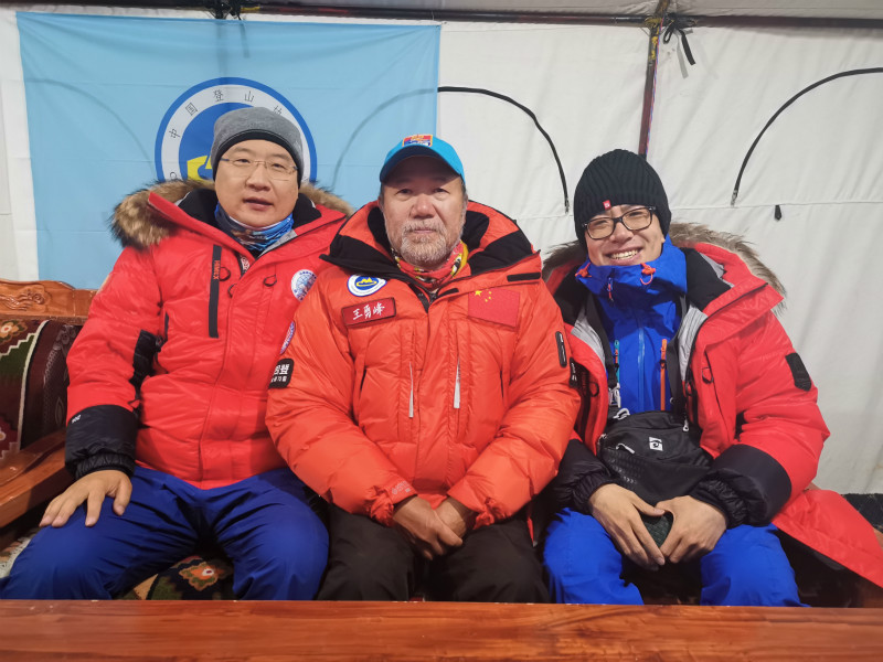 谷業(yè)凱(右)與中國登山隊(duì)隊(duì)長王勇峰(中)、人民日報(bào)記者袁泉(左)登頂前夜在珠峰大本營。