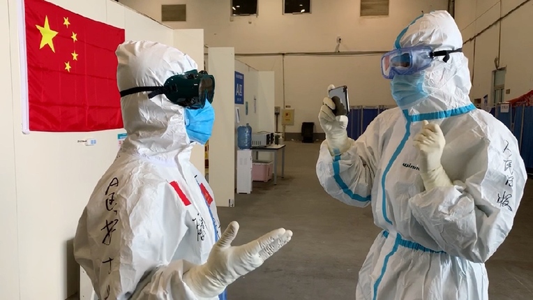 3月7日,武漢首批最大規模方艙醫院東西湖方艙醫院休艙現場,人民日報記者吳姍(右)見證最后一批轉院患者出艙。