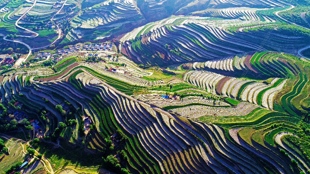 2019年6月9號拍攝于寧夏西吉縣偏城鄉上馬村。早上的太陽剛剛升起,照在薄膜地上猶如一道道發光的銀線,旱作梯田經過改良,壯觀而又美麗。(蔡全錄攝)
