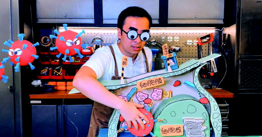“新型冠狀病毒在細胞外面游走過程中,總能找到對應的鎖眼,咔嚓,打開細胞上的鎖,天真的細胞誤以為營養物質來了,于是大門敞開……”在一個約4分鐘的視頻中,寧原在工作間的長桌上用自己制作的病毒、細胞等模型,為粉絲趣味介紹新型冠狀病毒是如何入侵人體的。他還邀請武漢大學醫學部病毒學研究所專家來釋疑病毒變異的相關問題,那期視頻獲得了500多萬次觀看量。