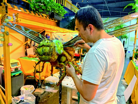 為了給人們解釋蜻蜓如何飛行覓食,寧原制作了一個放大數萬倍的彩色巨型“蜻蜓隊長”模型;為了展示蜘蛛織網的過程,他不僅制作了一個龐大的金色蜘蛛,還搭建了紙質樹林立體展板,還原小蜘蛛在樹林中織網的場景,讓觀眾看完恍然大悟、大呼過癮。