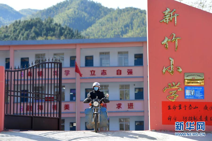 在江西省萬載縣高村鎮新竹村新竹小學,校長羅長石帶著拷貝了當日線上教育課程的U盤和新學期的書本,準備前往住在山里偏遠村組的幾位學生家里(2月17日攝)。新華社記者 彭昭之 攝