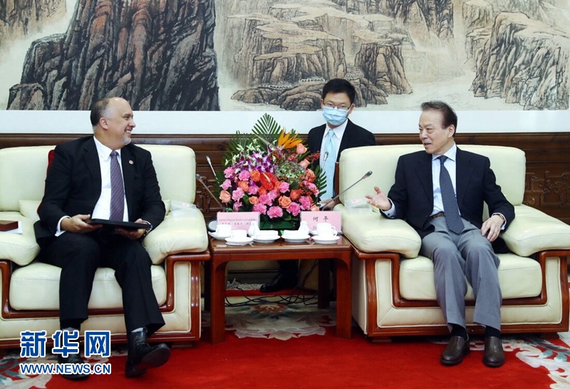 11月19日,新華社社長、總編輯何平在北京會見古巴駐華大使佩雷拉。新華社記者 鞠鵬 攝