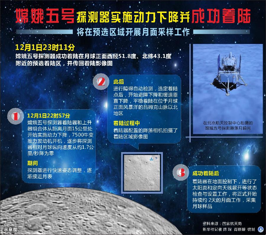 圖表:嫦娥五號(hào)探測(cè)器實(shí)施動(dòng)力下降并成功著陸 將在預(yù)選區(qū)域開(kāi)展月面采樣工作 新華社記者 陳琛 編制