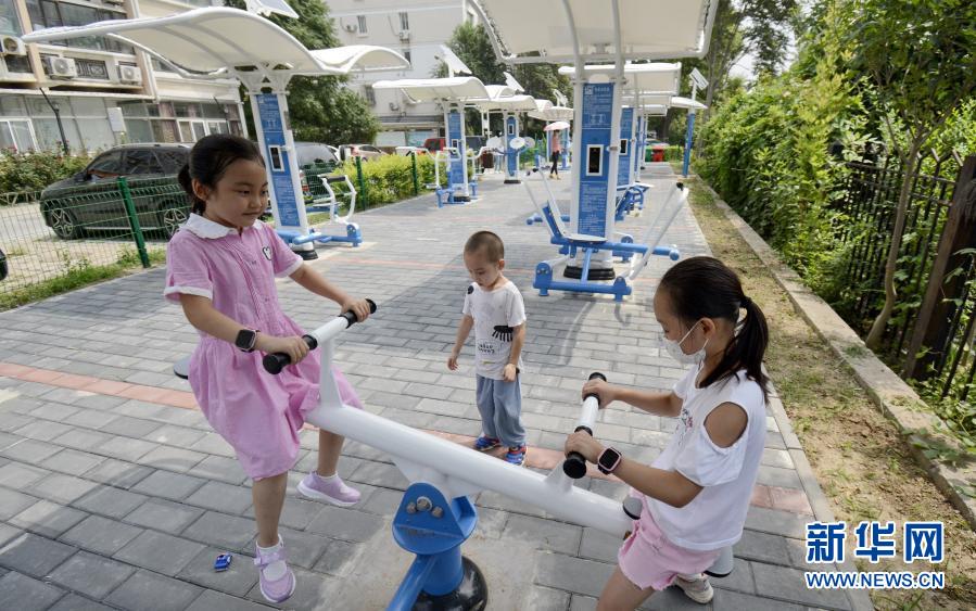孩子們在回龍觀龍澤苑社區內的健身廣場玩耍(8月11日攝)。新華社記者 李欣 攝