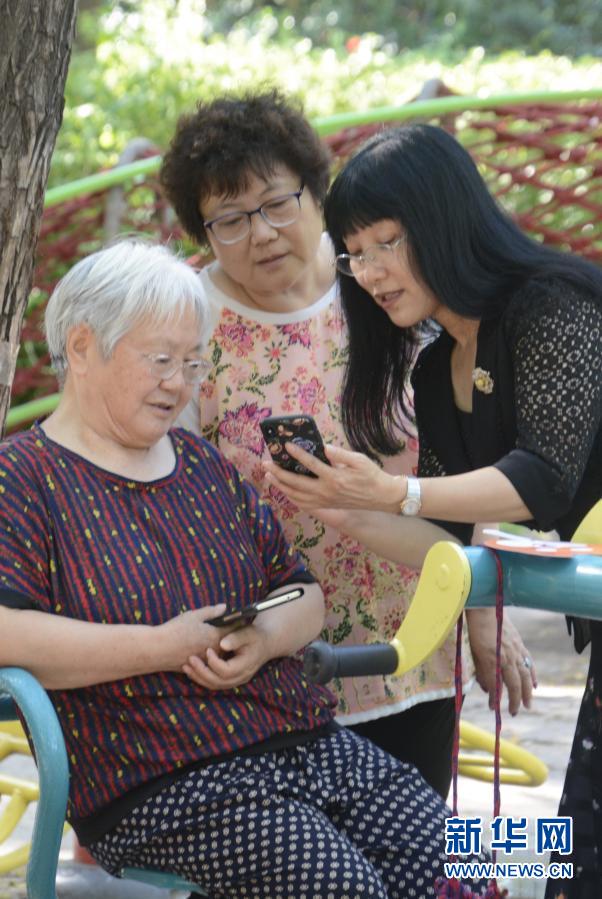 龍澤苑社區黨支部書記、居委會主任伊然(右)在社區內教老年人使用手機里的社區服務軟件(8月10日攝)。新華社記者 李欣 攝