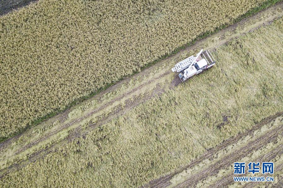 10月22日,工作人員駕駛收割機在海南海口龍華區龍泉鎮新江村收割晚稻(無人機照片)。
