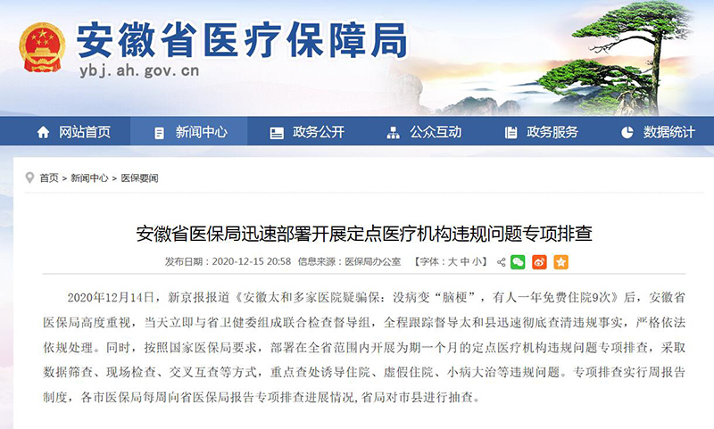 據安徽省醫保局網站消息,2020年12月14日,新京報報道《安徽太和多家醫院疑騙保:沒病變“腦梗”,有人一年免費住院9次》后,安徽省醫保局高度重視,當天立即與省衛健委組成聯合檢查督導組,全程跟蹤督導太和縣迅速徹底查清違規事實,嚴格依法依規處理。