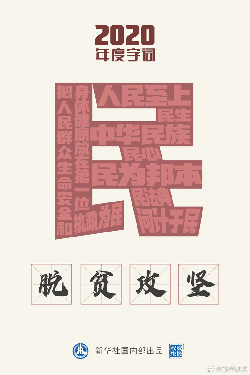 “民”當選2020年度“國內(nèi)字”;“脫貧攻堅”當選2020年度“國內(nèi)詞”。國家語言資源監(jiān)測與研究中心、商務(wù)印書館等21日發(fā)布“漢語盤點2020”年度字詞,定格我國年度記憶。這一年,從抗疫抗洪到民法典誕生、謀劃開啟“十四五”新征程,處處閃耀“人民至上”理念;這一年,如期完成脫貧攻堅目標任務(wù),千年夙愿,今朝夢圓!?