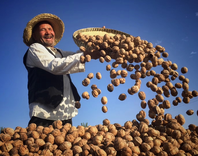 ????新疆喀什地區果農正在開心地晾曬核桃。