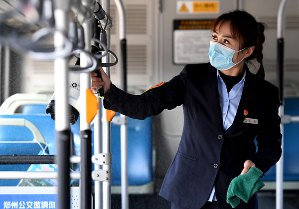 12月18日,黃菲在發車前噴灑消毒液給車輛消毒。