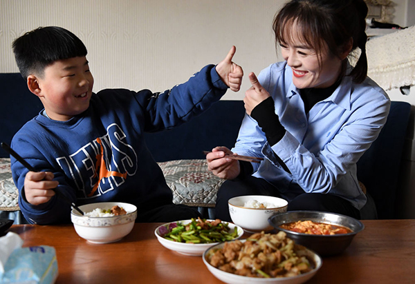 12月18日,黃菲8歲的兒子宋晗昱和媽媽一起吃午飯,并為媽媽做的飯菜點贊。