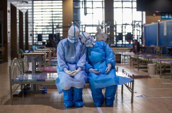 3月10日,兩名青海醫療隊隊員在武昌方艙醫院等待出艙時小憩。