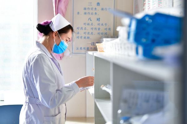 12月16日,海東市第一人民醫院內科護士劉海婷在藥房取藥。