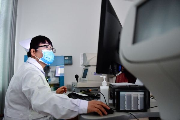12月16日,海東市第二人民醫院眼科護士許國娟在給患者檢查眼睛。