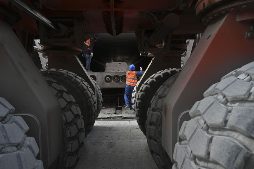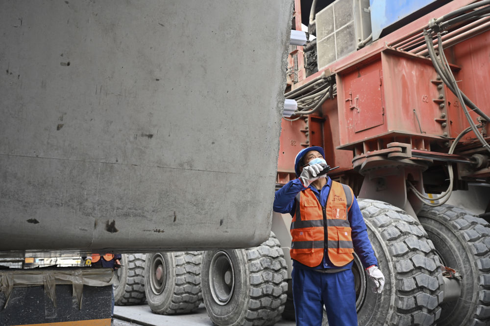 1月28日,杜學剛(左)和工友在擰緊提梁螺栓。