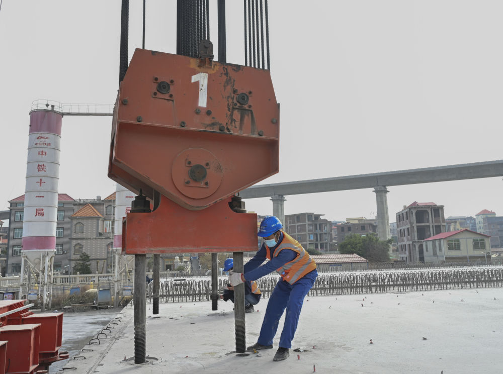 1月28日,在位于福建省莆田市的中鐵十一局新建福廈鐵路4標靈川制梁場,河南籍提梁班工人杜學剛在配合進行提梁作業。