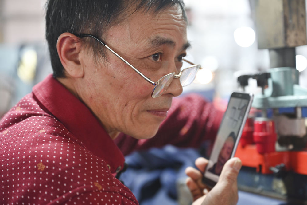 1月25日,在福建省福州市閩侯縣的億格戶外用品有限公司生產車間,四川籍計件工人張良國在休息時與大兒子視頻通話。