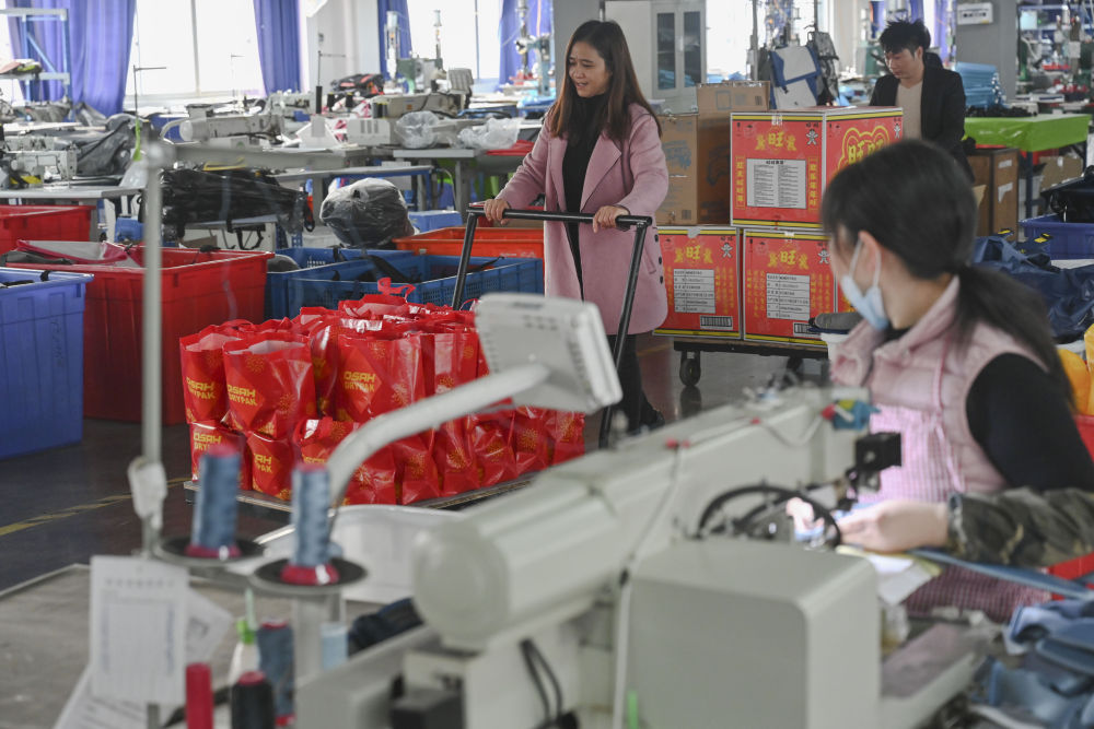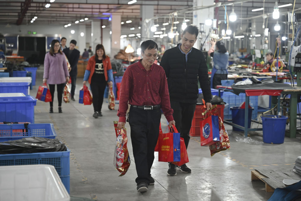 在福建省福州市閩侯縣一家戶外用品工廠,除了政府出臺的補貼政策之外,企業還為留下來的90多名工人發放了年貨大禮包,這些人中就包括張良國