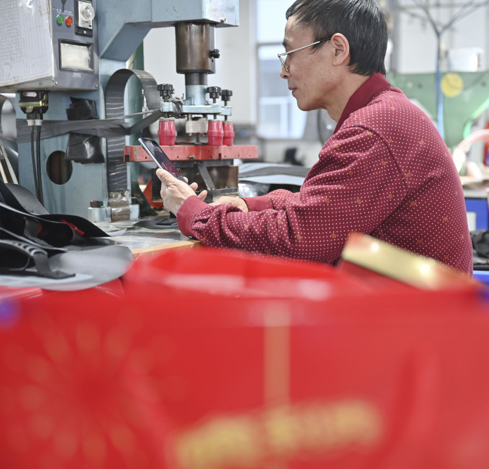 在工廠工作了十多年的張良國將領到的年貨拍成照片,發給遠在四川老家的兒子,告訴家人這里一切都好。