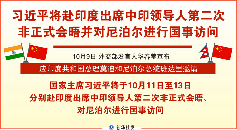 新華社北京10月9日電 外交部發言人華春瑩9日宣布:應印度共和國總理莫迪和尼泊爾總統班達里邀請,國家主席習近平將于10月11日至13日分別赴印度出席中印領導人第二次非正式會晤、對尼泊爾進行國事訪問。