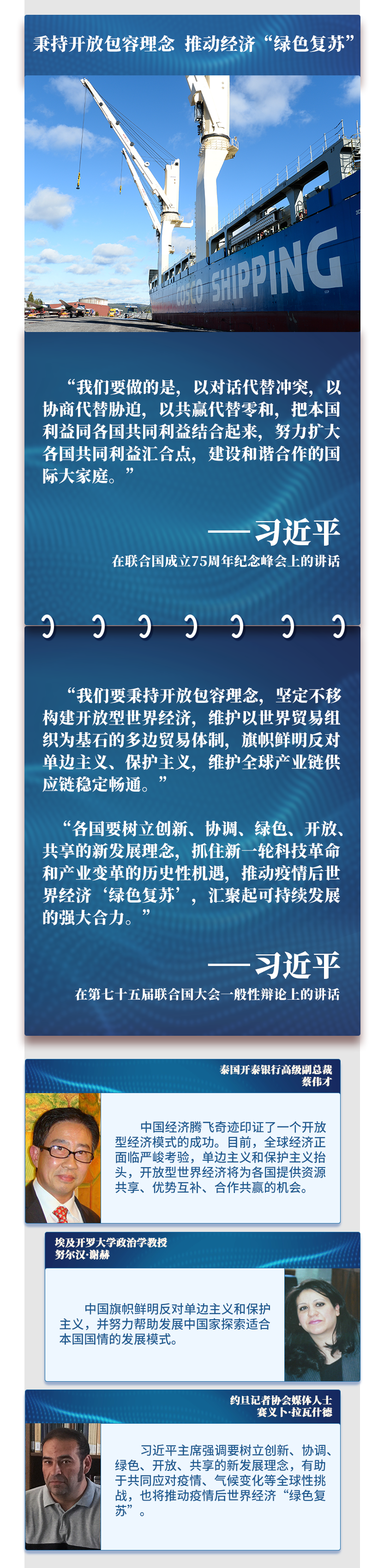 在聯(lián)合國(guó)成立75周年之際,習(xí)主席通過(guò)視頻方式,在聯(lián)合國(guó)這一多邊外交舞臺(tái)闡述關(guān)于國(guó)際秩序和人類(lèi)前途命運(yùn)的中國(guó)主張,為國(guó)際社會(huì)應(yīng)對(duì)全球性挑戰(zhàn)、推動(dòng)共同發(fā)展指明方向,為世界各國(guó)攜手構(gòu)建人類(lèi)命運(yùn)共同體、共創(chuàng)更加美好的未來(lái)注入信心和動(dòng)力——