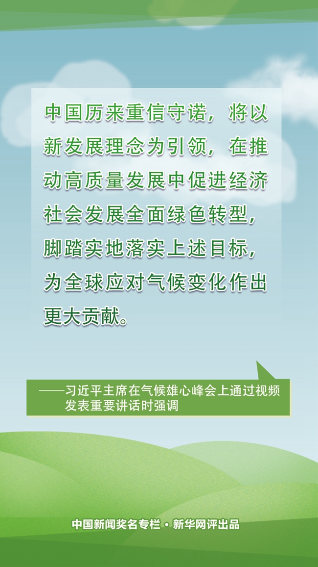 當前,中國正處于實現中華民族偉大復興的關鍵時期,發展經濟、改善民生的任務十分繁重,但中國仍然以最大決心和最積極態度參與全球應對氣候變化共同行動。在提前完成2020年應對氣候變化相關目標的基礎上,中國宣布碳中和目標、提出大幅提升風電和太陽能發電量等國家自主貢獻新舉措,將以新發展理念為引領,在推動高質量發展中促進經濟社會發展全面綠色轉型,腳踏實地落實今后十年新的減排目標,為全球應對氣候變化作出更大貢獻。中國不斷以實際行動向世界表明,中國始終是全球環境治理的積極參與者與貢獻者,為全球應對氣候變化樹立典范,為推動全球氣候治理注入信心和力量。