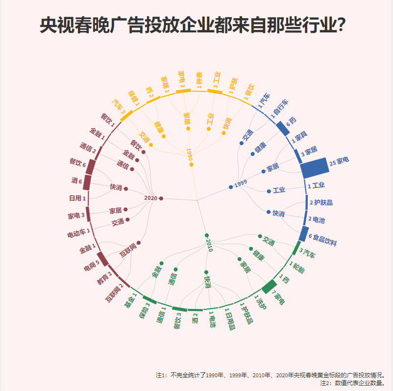 據記者不完全統計,在春晚開播前的黃金標段,1990年共有16條廣告,涉及的行業多為工業、汽車、家電等行業。1999年,春晚廣告數量增加至48條,其中家電行業的廣告最多,足足有25條,包括VCD、電視、空調、家庭影院、冰箱、家用電腦等。2010年廣告數量僅為26條,快消和家電行業的廣告數量不相上下,通信和金融也出現在這一年的廣告中,成為“新秀”。2020年,廣告數量為31條,家電的廣告不再常見,快消和互聯網行業的各占了三分之一。