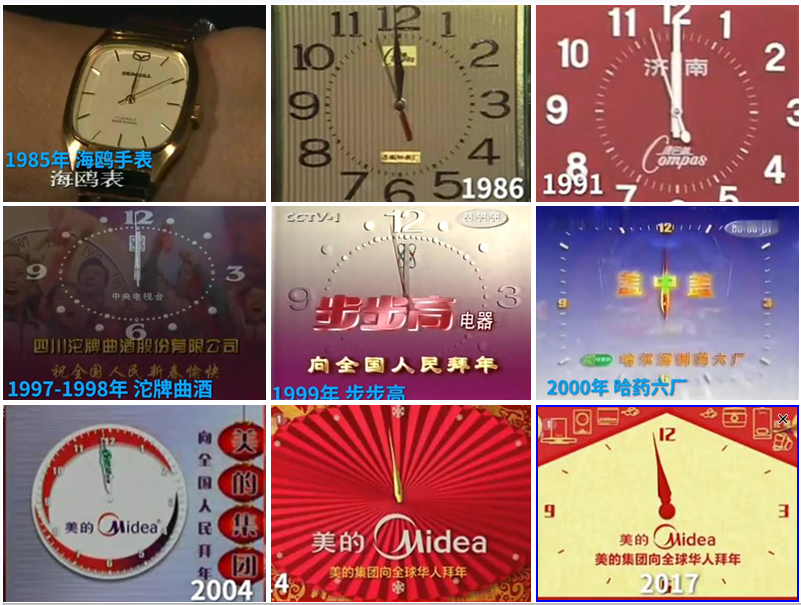 在2011年之前,歷年春晚不乏形式多樣的廣告,比如“企業賀電廣告”、片尾鳴謝字幕廣告、冠名廣告和報時廣告等。其中報時廣告最受矚目,報時廣告一般出現在春晚開播的時候以及零點倒計時,畢竟在那時,所有的觀眾都盯著鐘表上的秒針一點一點朝著“12”這個數字走去,這個露出絕無僅有。