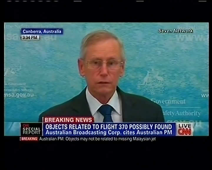 ??? 澳方稱在印度洋中發(fā)現(xiàn)了可能與馬航失聯(lián)客機有關(guān)物體這張3月20日拍攝的CNN視頻截圖顯示,澳大利亞海事安全局官員在堪培拉召開的新聞發(fā)布會上發(fā)言(左圖為相關(guān)搜尋海域的示意圖)。澳大利亞總理阿博特當(dāng)日在議會說,澳方在印度洋中發(fā)現(xiàn)了可能與馬航失聯(lián)客機有關(guān)的兩個物體。澳大利亞海事安全局官員當(dāng)日說,發(fā)現(xiàn)可疑碎片的位置與之前確定的馬航失聯(lián)客機南部搜尋航道高度吻合,但當(dāng)?shù)睾S蛩沫h(huán)境非常差。新華社發(fā)