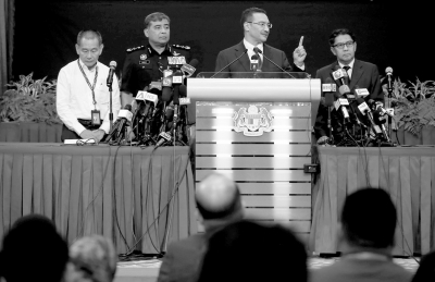 昨天,馬方發(fā)布會在吉隆坡舉行,代理交通部長希沙姆丁(左三)在發(fā)布會上答記者問。中新社發(fā)