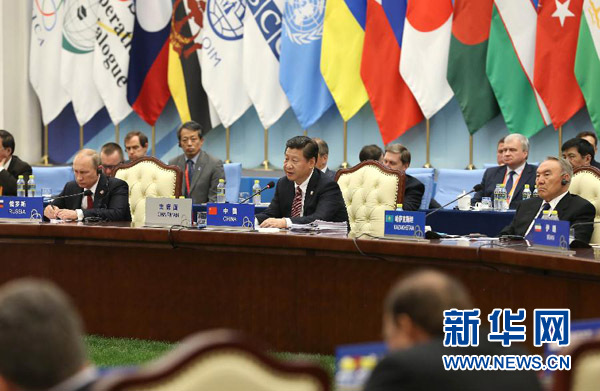 ????5月21日,亞洲相互協作與信任措施會議第四次峰會在上海舉行。中國國家主席習近平主持會議并發表題為《積極樹立亞洲安全觀共創安全合作新局面》的主旨講話。 新華社記者 龐興雷 攝
