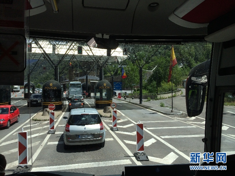 ????大巴車在西班牙和安道爾兩國邊境處等待進入安道爾。(周喆 攝)