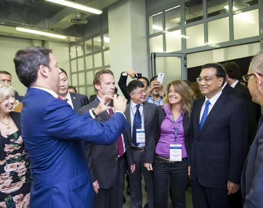 今天的活動中,克強總理結束致辭離開會場時,正好從董柔心身旁走過。她抓住時機,用中文同克強總理打招呼。這招也成功地引起了克強總理的注意。克強總理不僅夸她中文說得不錯,還欣然應允了合影的要求。一旁的倫齊連忙“貼心地”拿過董柔心的手機,幫他倆拍下了合影。