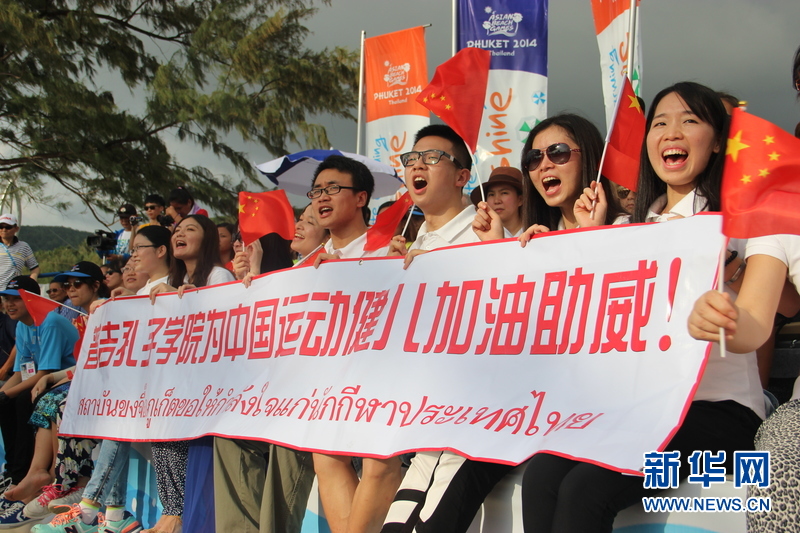 ??? 11月16日,普吉孔子學院的中國志愿者老師們為中國運動健兒加油。中國體育代表團16日在泰國普吉舉行的第四屆亞洲沙灘運動會上勇奪2枚金牌和2枚銅牌。當天比賽全部結束時,中國隊以3金2銀5銅的成績暫列獎牌榜第五,東道主泰國隊以9金11銀12銅的成績暫列金牌榜和獎牌榜第一。新華社記者楊云燕攝
