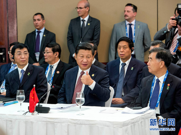 “建設開放型世界經濟。世界貿易擴大了,各國都受益。世界市場縮小了,對各國都沒有好處。我們要繼續做全球自由貿易旗手,維護多邊貿易體制,構建互利共贏的全球價值鏈,培育全球大市場。要繼續反對貿易和投資保護主義,推動多哈回合談判。要推動各種自由貿易協定做到開放、包容、透明、非歧視,避免市場分割和貿易體系分化。”