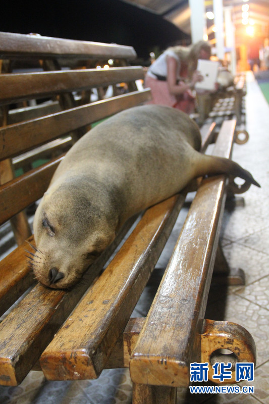 一只海獅睡在圣克魯斯(Santa Cruz)島碼頭的長椅上。