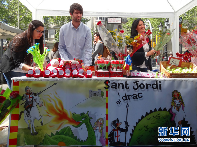 今年的“圣喬治節”是個天空晴朗陽光燦爛的日子,在巴塞羅那市中心的加泰羅尼亞廣場及周邊街道上,臨時搭建起了很多賣書和賣花的攤位。大街上到處可以見到手持鮮花的女士,或者拿著書的男士。